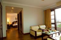 Suite: features one double bed and one living room with a view of the Perfume River and Con Hen from window and balcony; 60sqm