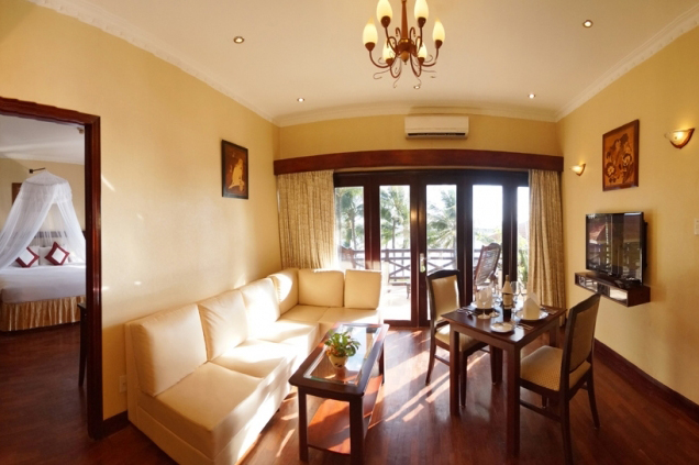 President suite 1- The 77 square meters solid wood bungalow, designed in Vietnamese style consisting two bedrooms (connecting door), two large comfortable private bath-rooms with Jacuzzi, a luxurious living room with bar, kitchenette and dinning table suitable for a family with four people. Modern furnished furniture and equipped high speed internet. A private balcony with six sunny sofas, a spacious private garden 120 square meter and a super view of the ocean.